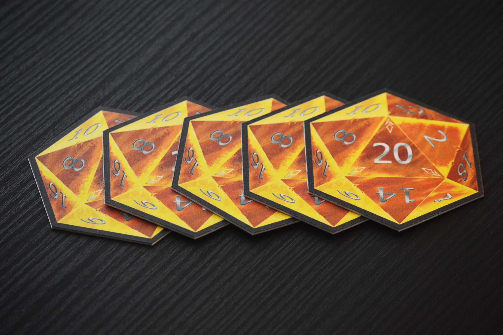 Pack of 5 hexagonal D20 coasters in yellow. Front features the 20 side of the dice and the back features the 1.